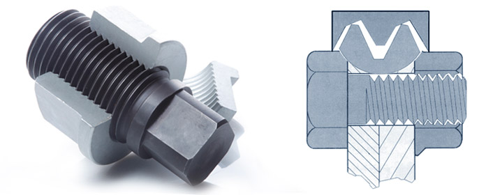 從上圖可以看出,30°楔形螺紋在大徑上有一特制的楔形斜面,由于這斜面能將施加的負(fù)荷均勻地分布在聯(lián)結(jié)螺栓配合部位的全長(zhǎng)上,因此對(duì)局部螺紋不易造成磨損或疲勞斷裂。而30°楔形螺紋因其特殊的結(jié)構(gòu),它具有抗橫向振動(dòng)的異常能力,能有效地防止橫向振動(dòng)導(dǎo)致的螺紋松動(dòng), 30°楔形螺紋特制的斜面均勻地將外螺紋外圓頂部延螺旋面緊緊地“抱住”,施加的扭力矩在徑向上的分力,這也是30°楔形螺紋為什么能抗橫向振動(dòng)而具有奇特防松性能的主要原因,再則,由于30°楔形螺紋的結(jié)構(gòu)特點(diǎn),它克服了由于螺距誤差等因素而造成的普通螺紋聯(lián)結(jié)時(shí)負(fù)荷分布不均的現(xiàn)象,而是將有效載荷均勻的分布在螺紋聯(lián)結(jié)部位的全長(zhǎng)上,增加了防松的能力。施加同樣的鎖緊力矩,對(duì)于普通螺紋,主要表現(xiàn)為軸向負(fù)荷,而對(duì)于30°楔形螺紋,則主要表現(xiàn)為徑向負(fù)荷,即30°楔形螺紋將外螺紋件緊緊地“抱住”的力量較大。