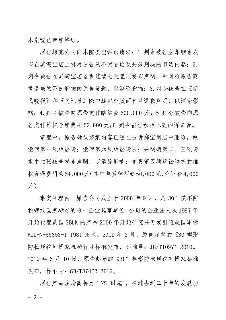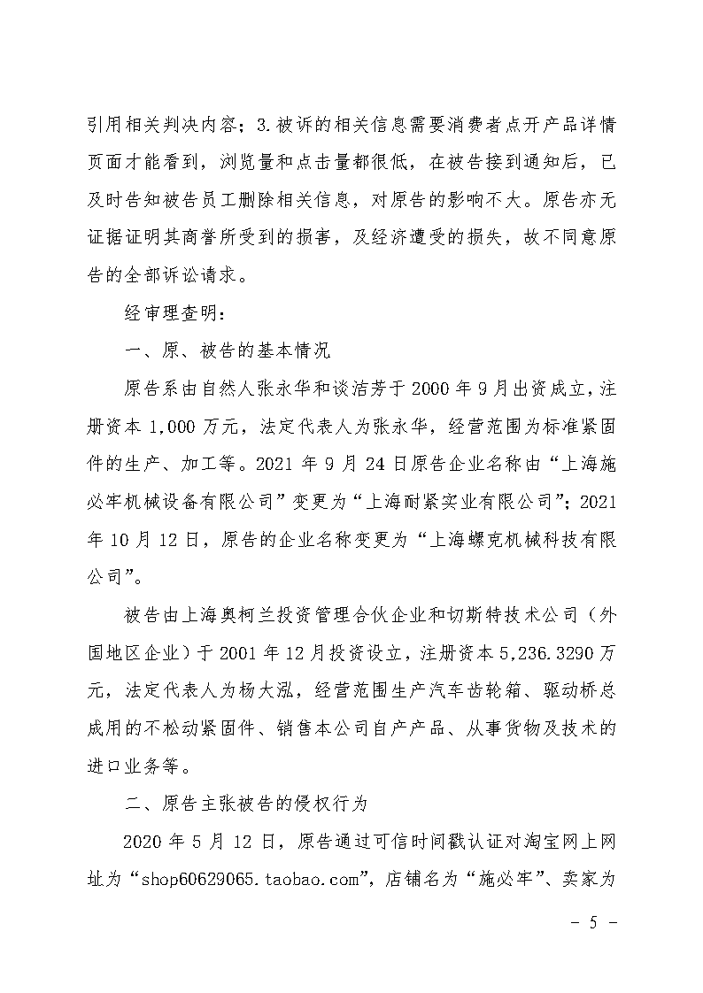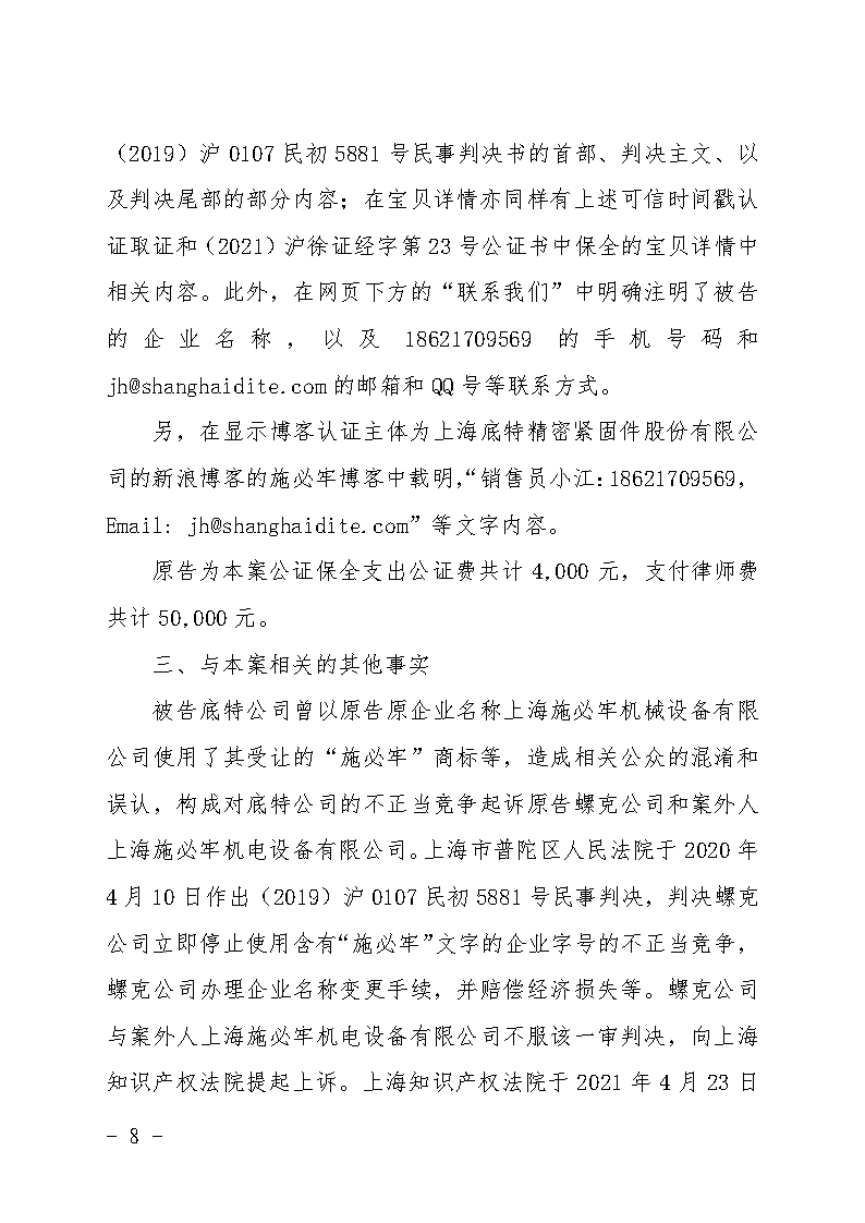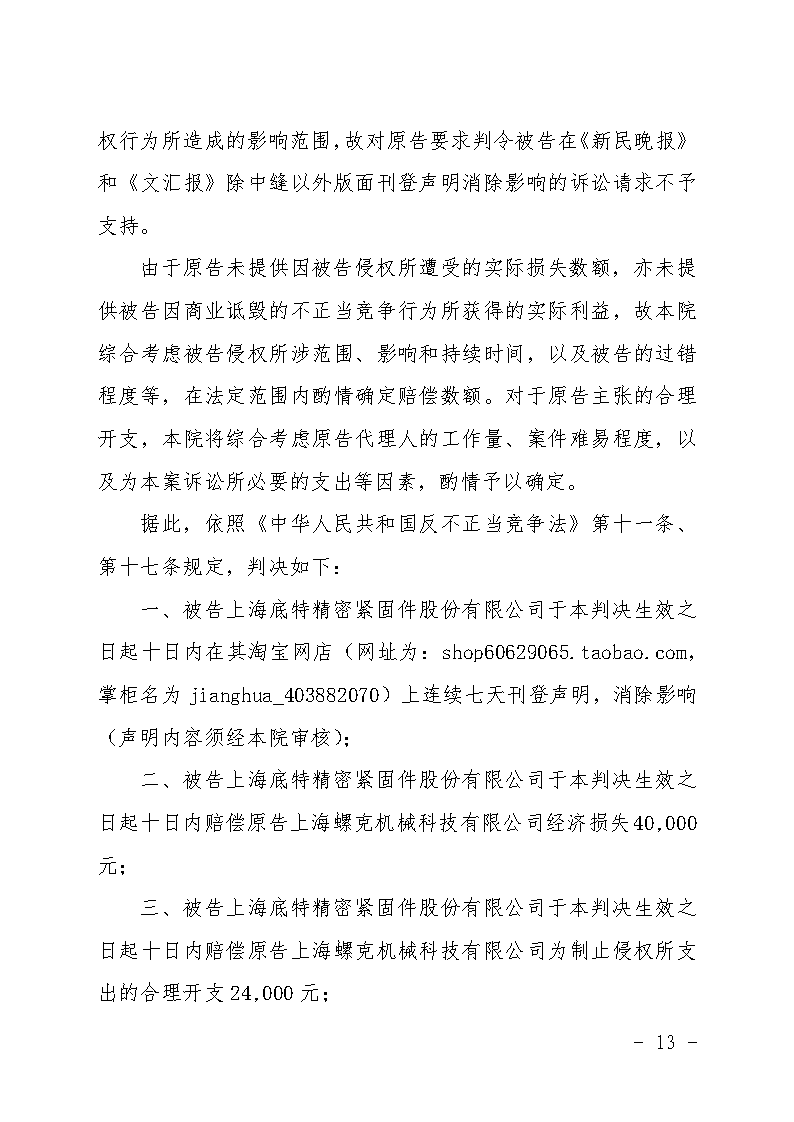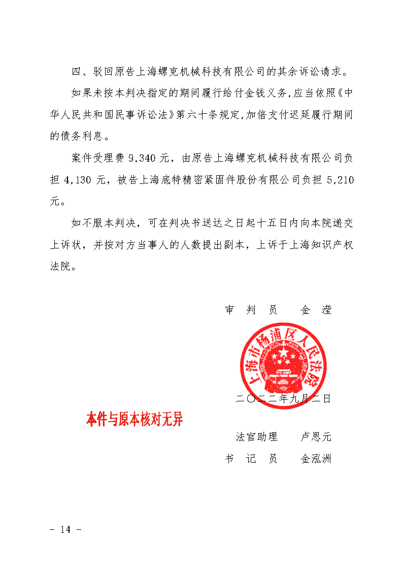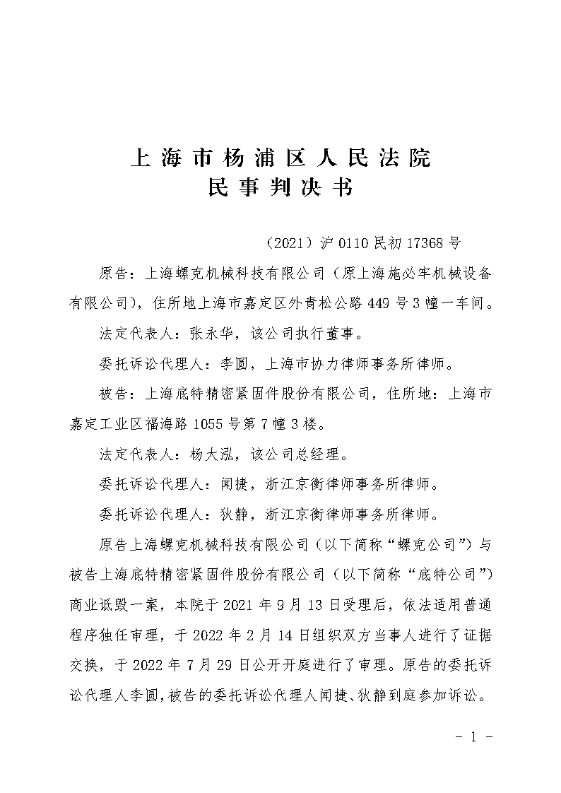 上海螺克機(jī)械科技有限公司狀告上海底特精密緊固件股份有限公司一審勝訴